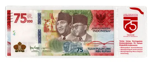 Aceasta bancnota aniversara infatiseaza portretele presedintelui Sukarno (Soekarno) si prim-ministrului Mohammad Hatta, primii lideri ai Indoneziei independente. Pe fundalul verde se pot remarca simboluri hindu-budhiste precum cel al Barong-ului.